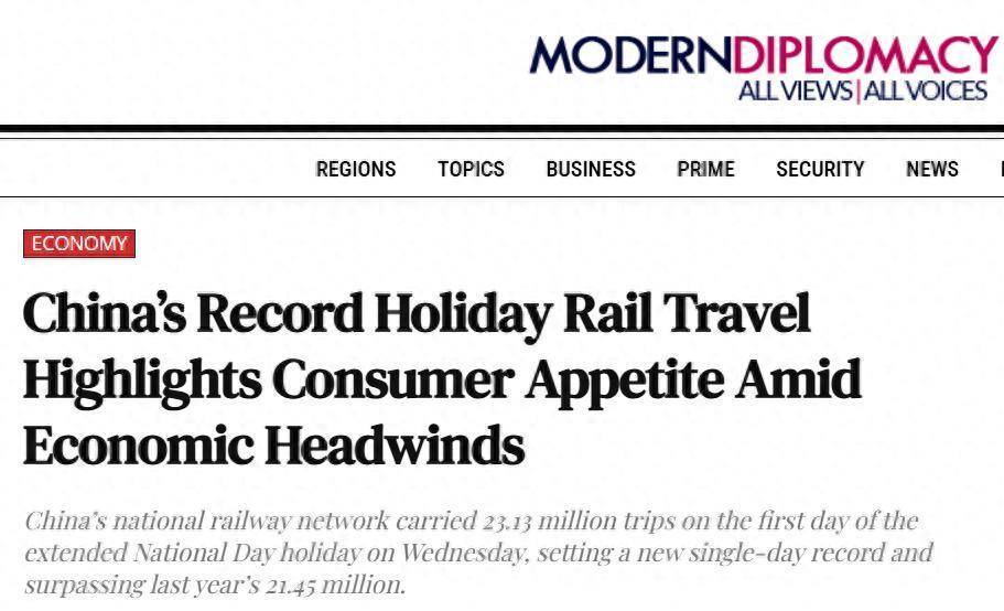 欧洲《现代外交》(Modern Diplomacy)网站报道注意到,中国国庆中秋“超长黄金周”首日,全国铁路发送旅客2313万人次,创下单日历史新高。报道援引官方预测称,整个八天假期出行总量预计将达23.6亿人次,日均出行近3亿人,堪称“史上最忙假期”。