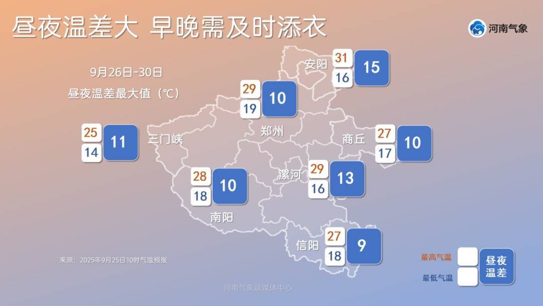 温度方面,预计今后五天,我省最高气温相对平稳,基本稳定在25℃上下,最低气温15℃左右,昼夜温差逐渐增大,尤其是在30日,昼夜温差多地可超10℃。建议大家及时关注气温变化,适时调整着装,谨防感冒。